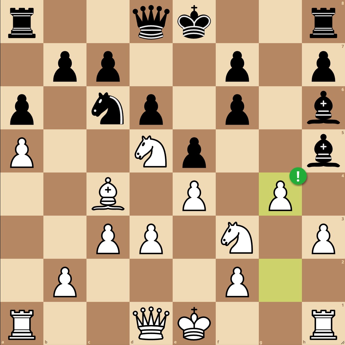 Our knight is pinned to the queen. However, we haven't castled which gives us a little bit of flexibility when it comes to dealing with the pin: 1.h3 Bh5 2.g4!